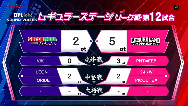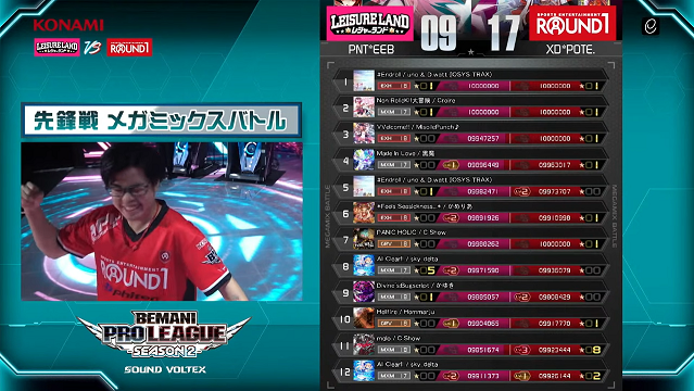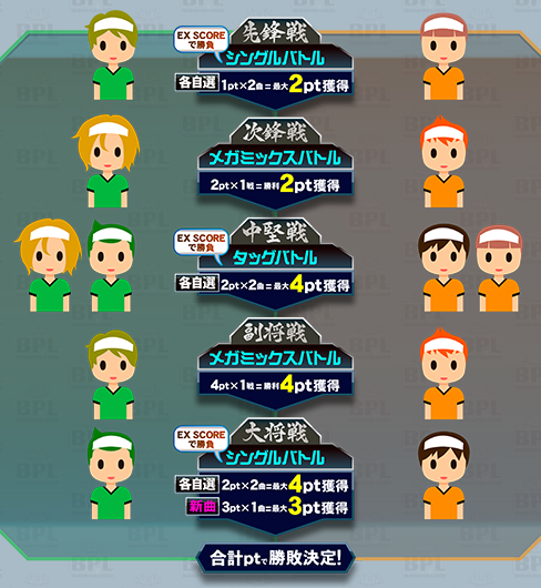 先鋒戦(メガミックス)と大将戦の3曲目(初見勝負)で勝利すると3pt、それ以外の楽曲で勝利すると2ptです。