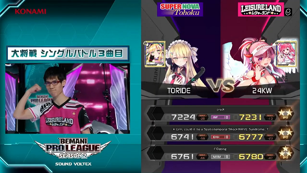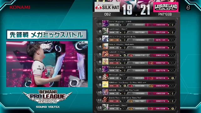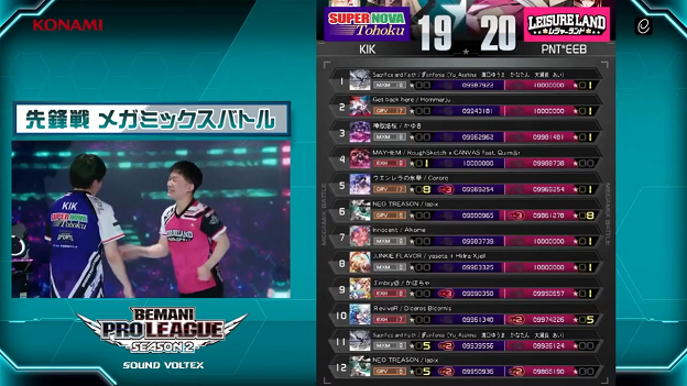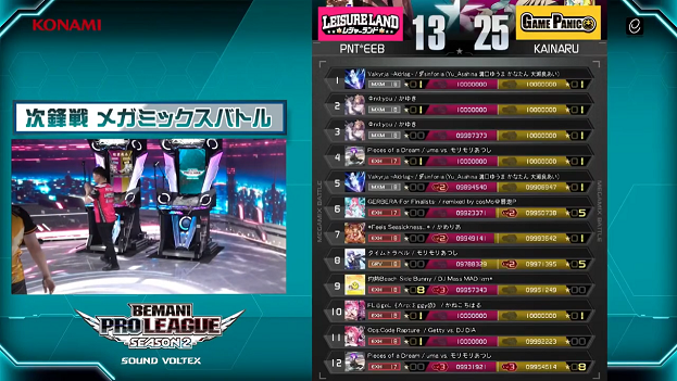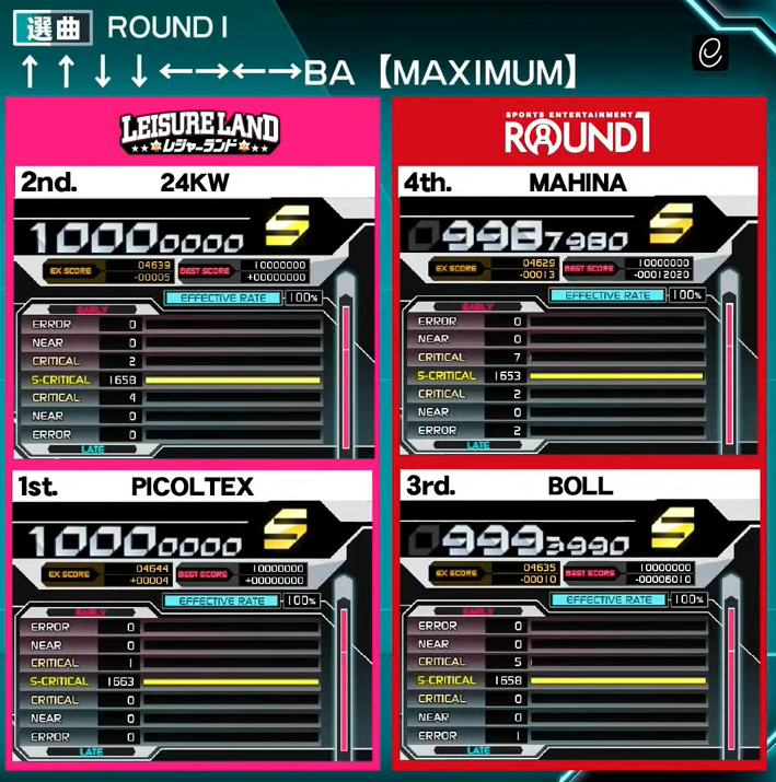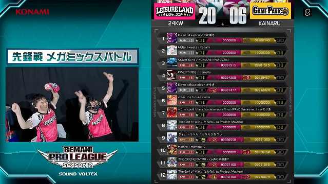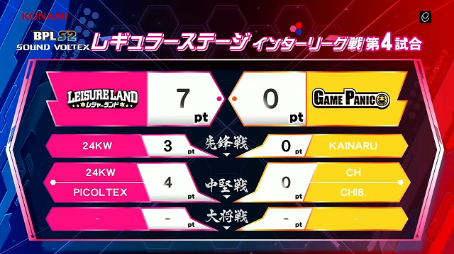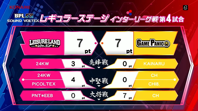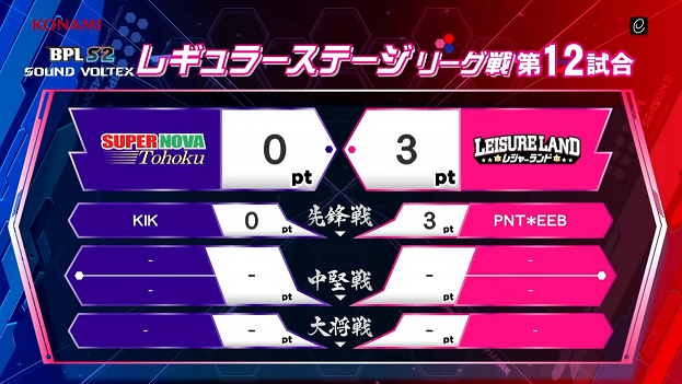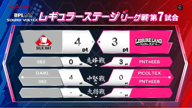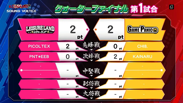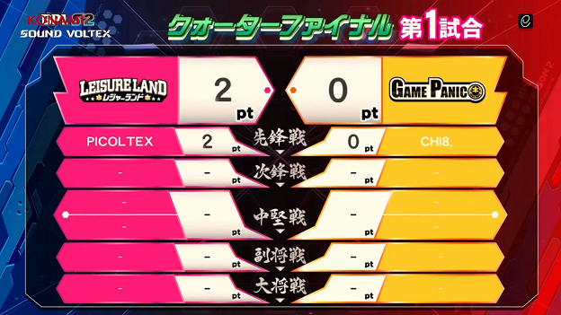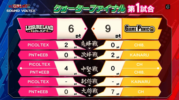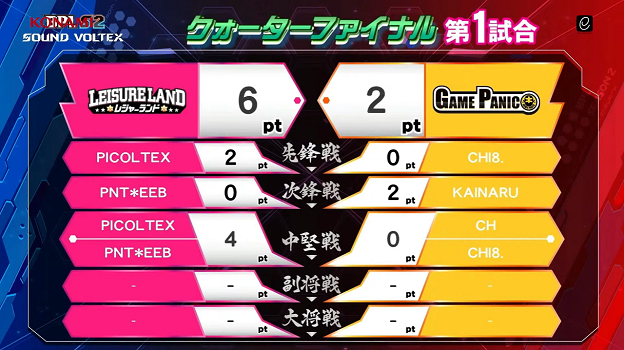 IIDXの各試合は4名に対し3枠だったということで試合ごとにオフとなる選手が発生していましたが、SOUND VOLTEXの各試合は3名に対し4枠。毎回、3名のうち誰かが2枠出るということになります。