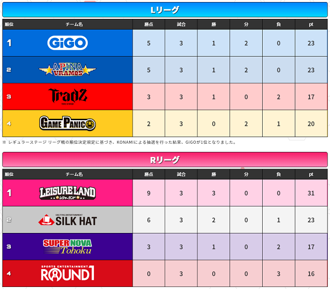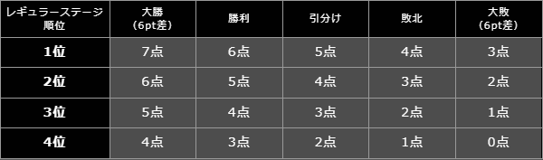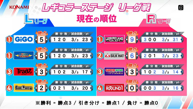 WANIROU選手作成のスライドにもある通り、レギュラーステージは8チームをLリーグ、Rリーグの2リーグに分けてそれぞれで総当たり戦を実施します。各リーグ4チームずつになるので、それぞれのチームが3試合ずつ行うことになりますね。