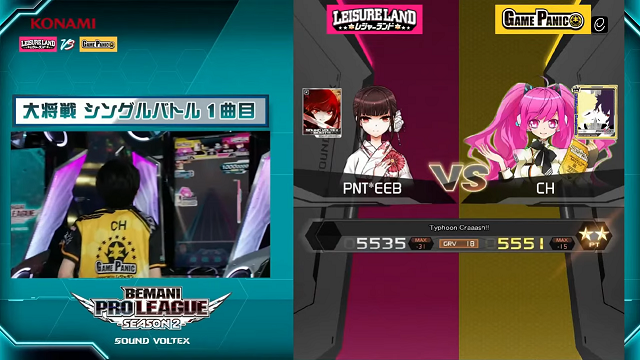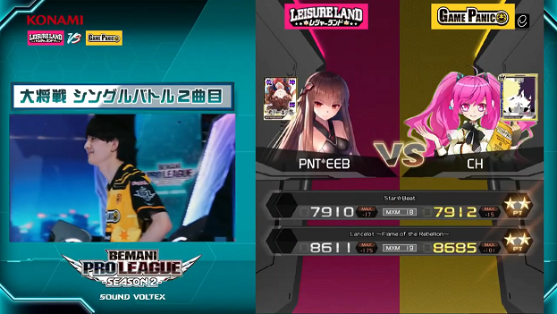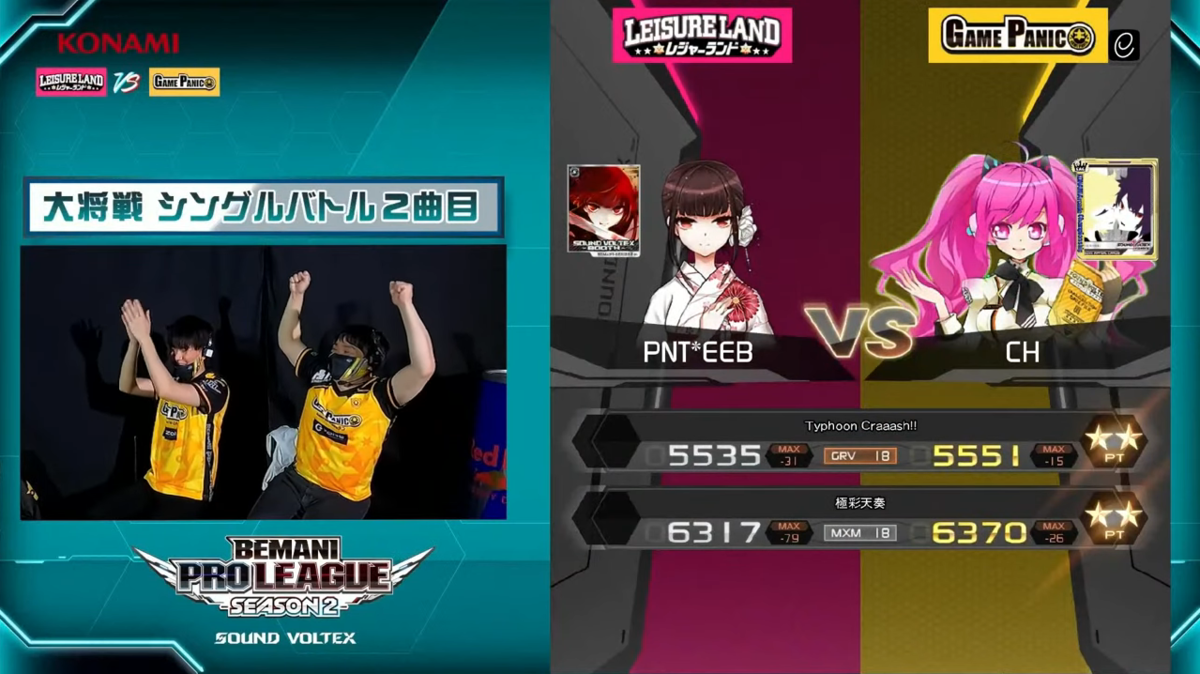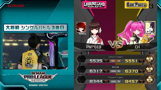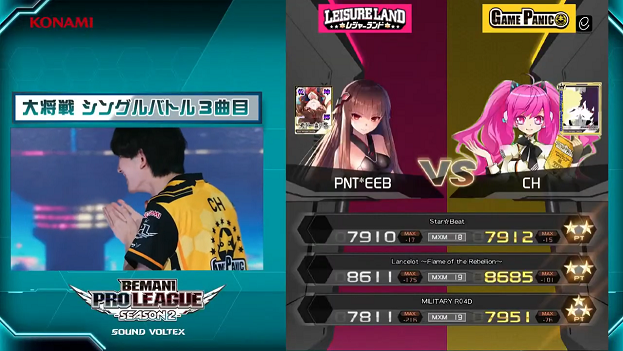 CH選手が大将戦に出場してくる以上、とにかくレジャーランドが勝利をする一番可能性の高いパターンである「副将までで8pt稼いで、大将で自選曲を通す」、つまり「先鋒or次鋒で2pt、中堅で自選2pt、副将で4pt」を目指そうという部分は変わりませんでしたので、私もPNT*EEB選手も目標がハッキリしていたかな、と思います。